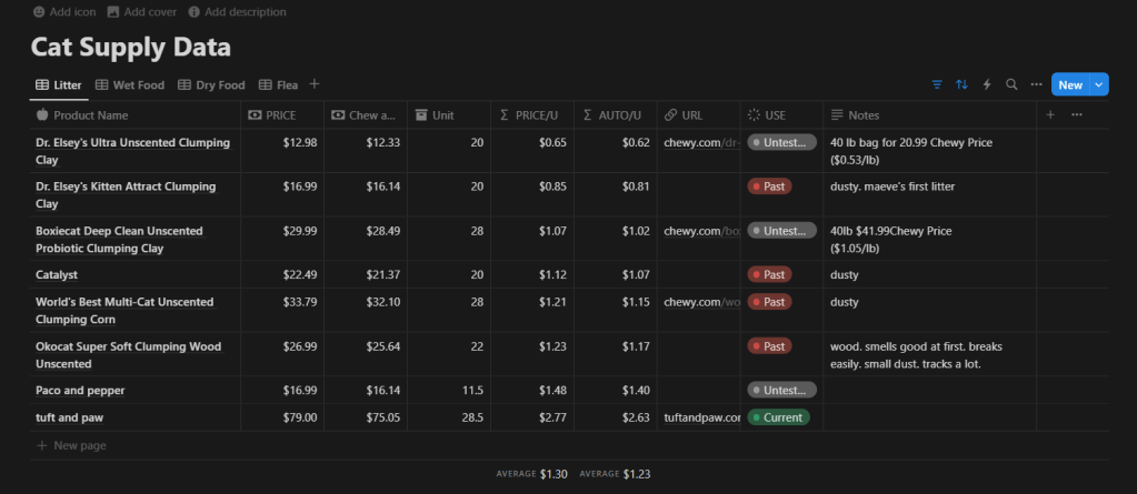 Nowadays I’ve realized my cat doesn’t care for quality or price, but as a new kitten parent I wanted the best litter/food/whatever for the cat. So I created this Notion list: